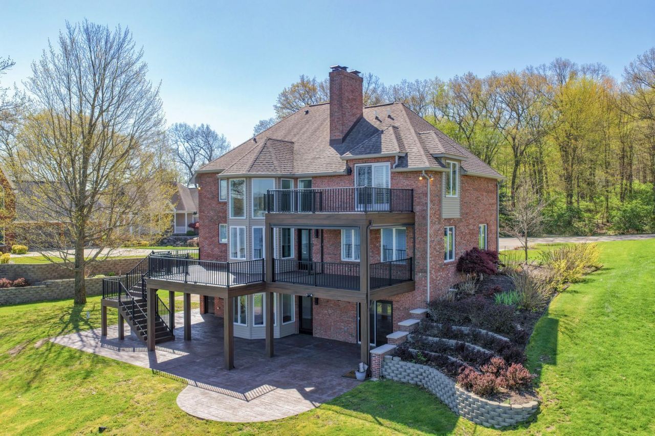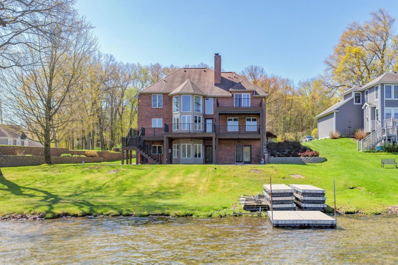 5 BD 4 BA, 4,173 sq-ft 2-story brick home w/walkout on .25-acre lot w/ 101 feet of all-sports Corey Lake waterfront. 640-acre lake, 80 feet at its deepest, prime fishing spot, has lowest density of homes among large Southwest Michigan lakes, one-third of shore bordered by 2 historic camps. The house is completely transformed w/ new kitchen, wet bar, refurbished bathrooms, added bathroom, new flooring, fixtures, paint. 3-story tower w/ bay windows, panoramic views. Main level: living area w/ soaring ceilings, dual brick gas log fireplace shared w/ family room, access to large upper deck; kitchen w/ island w/ bar seating; dining area; BD; laundry; BA. Upstairs: large landing; primary BD w/ woodburning fireplace, access to private balcony; primary BA w/ dual vanities, tiled walk-in shower, walk-in closet; two BD; BA w/ dual vanities. Downstairs: living area w/ partly covered patio access, kitchenette, BD, storage/utility, BA. 3-car attached garage, geothermal heat, terraced landscaping.
